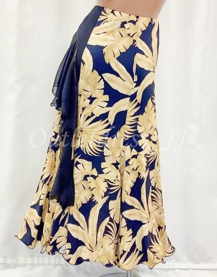 シックでリッチ感あふれるリーフ柄に黒の縦フリルが動きを華やかに見せてくれます。