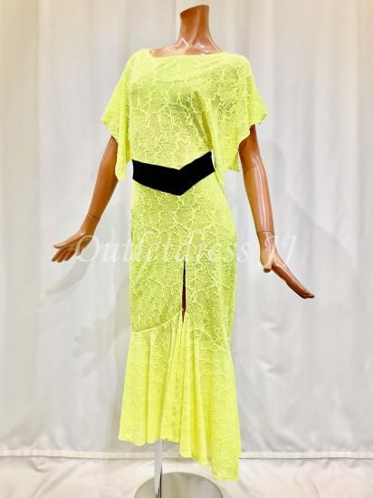 鮮やかなネオンカラーが人目を惹くワンピースです。黒ベルベットでウエストをマークしているのでスタイルアップも叶います。スリットが入っているのでラテンにもおすすめです。