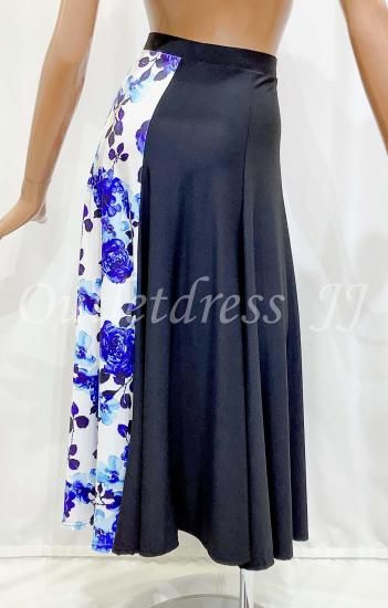 水彩絵の具を溶いたようなブルーの花柄が人目を惹くスカートです。合わせやすいブラックとホワイトを基調にしているため、アシンメトリーなデザインでもコーディネートの幅が広がります。